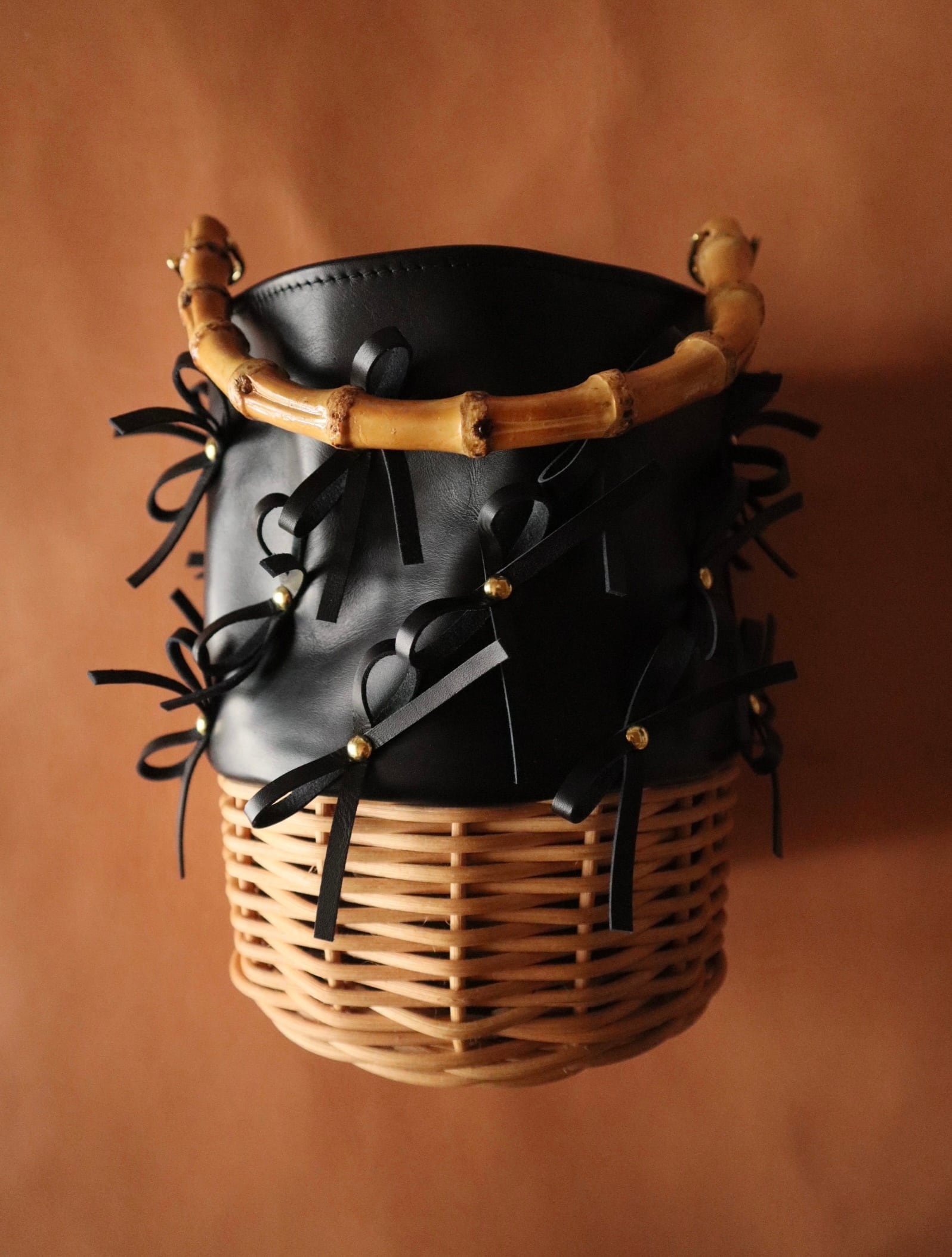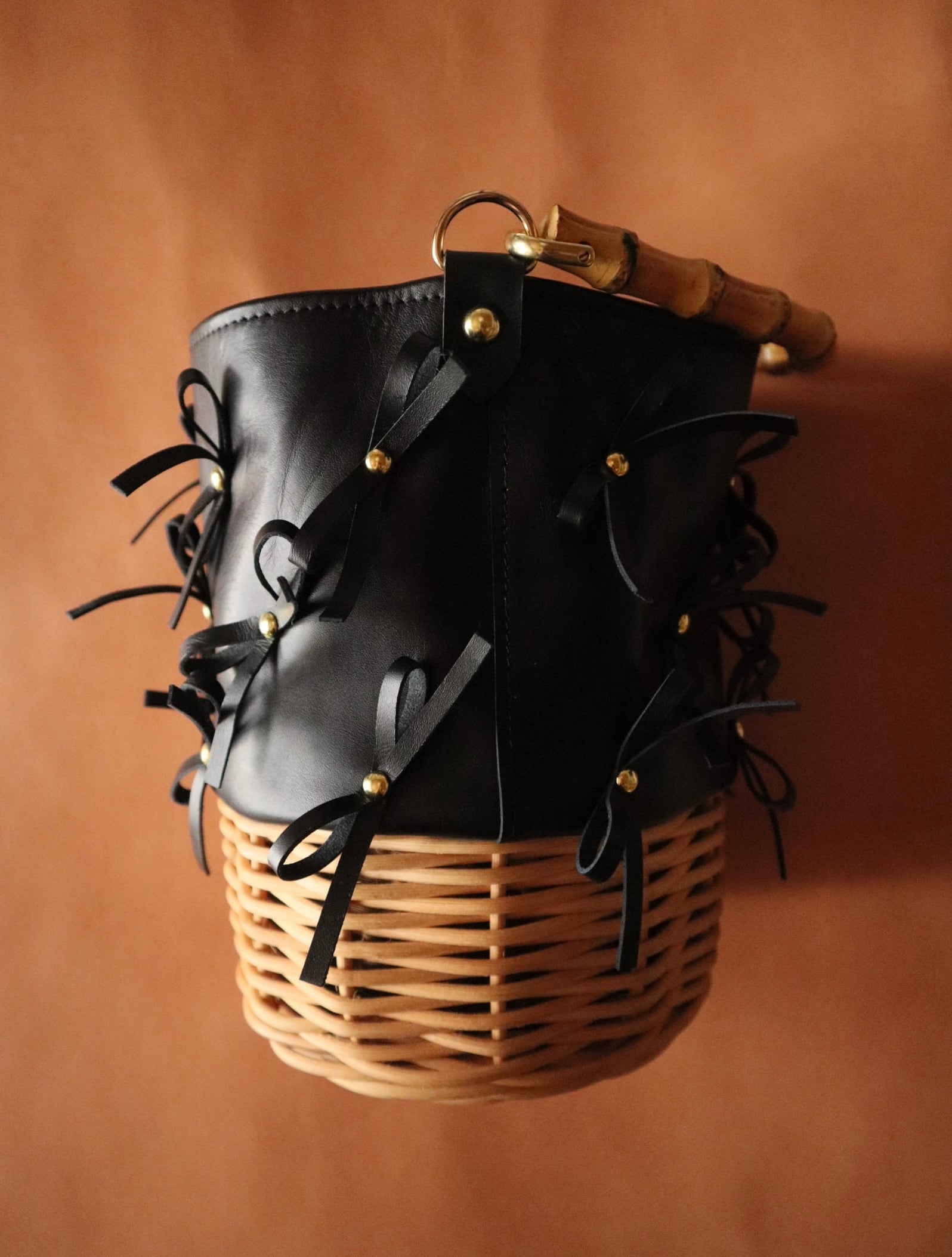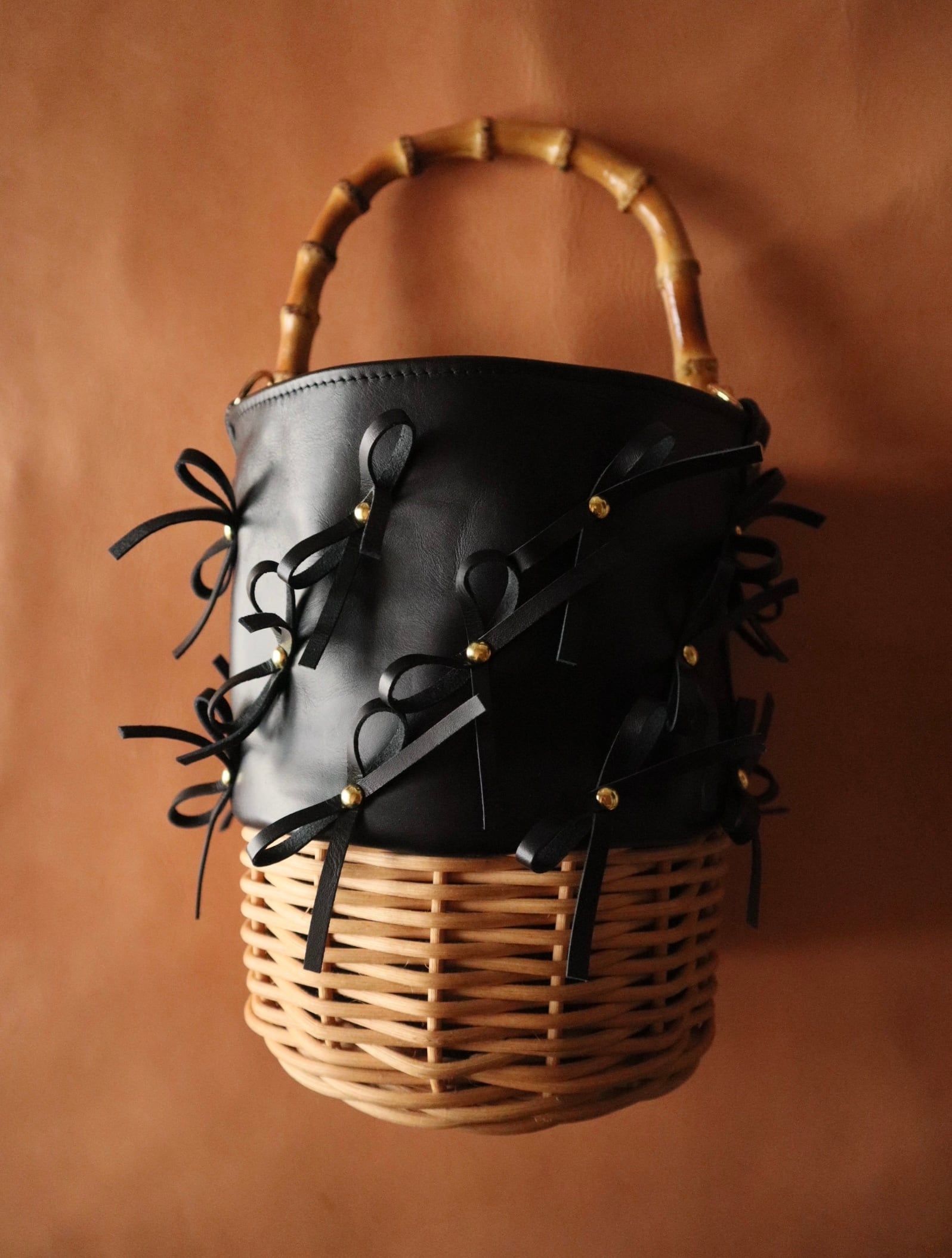 Ribbon bのかごバッグは籐のかごとリアルレザーとスタッズなどの異素材をミックスした作品はオリジナルデザインです。