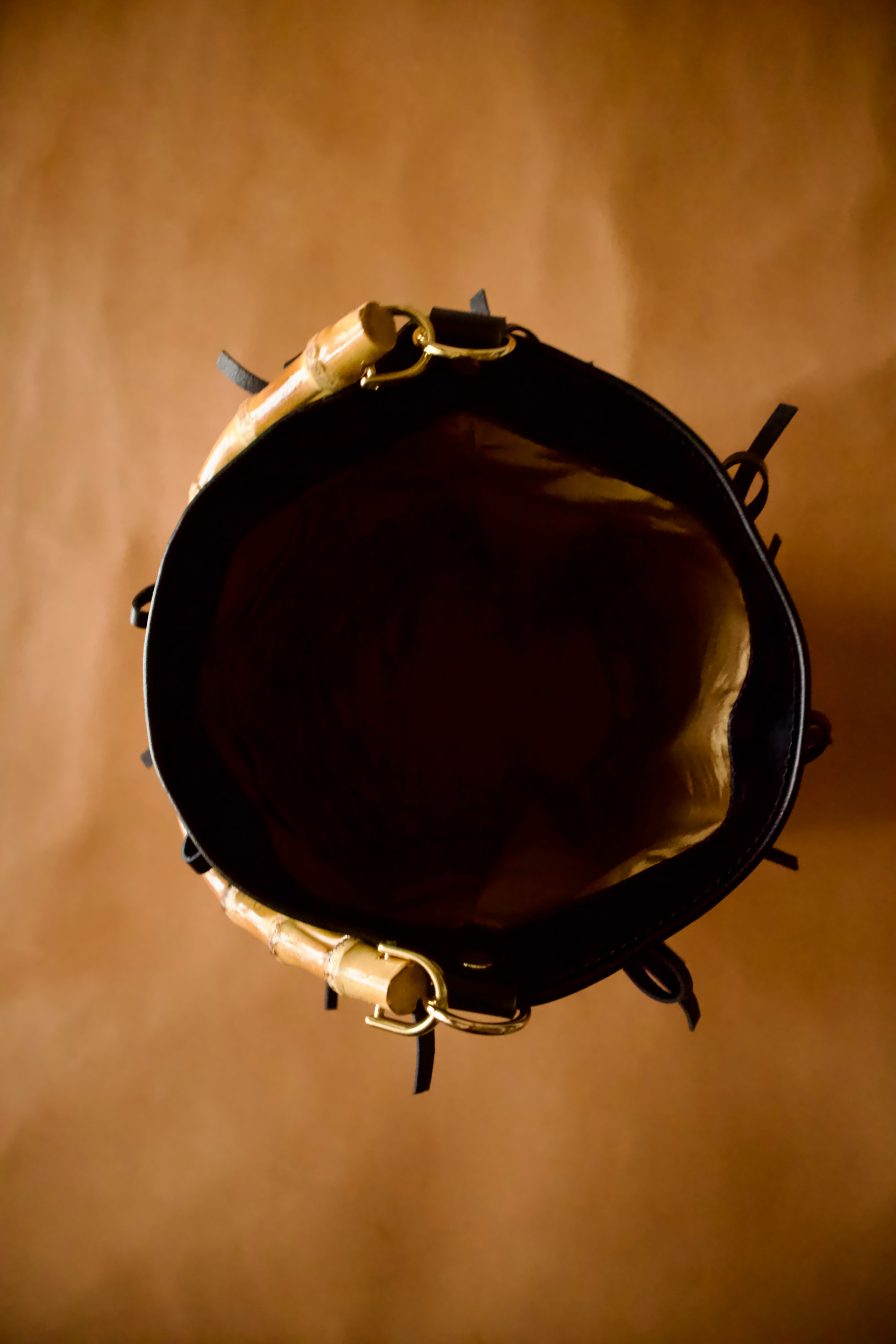 籐の裏とレザーの内側はコットン、ハンドル バンブー (竹)