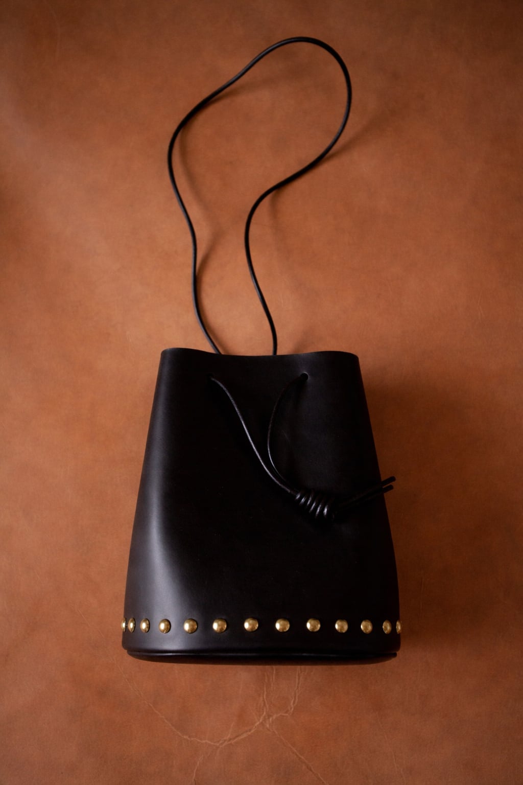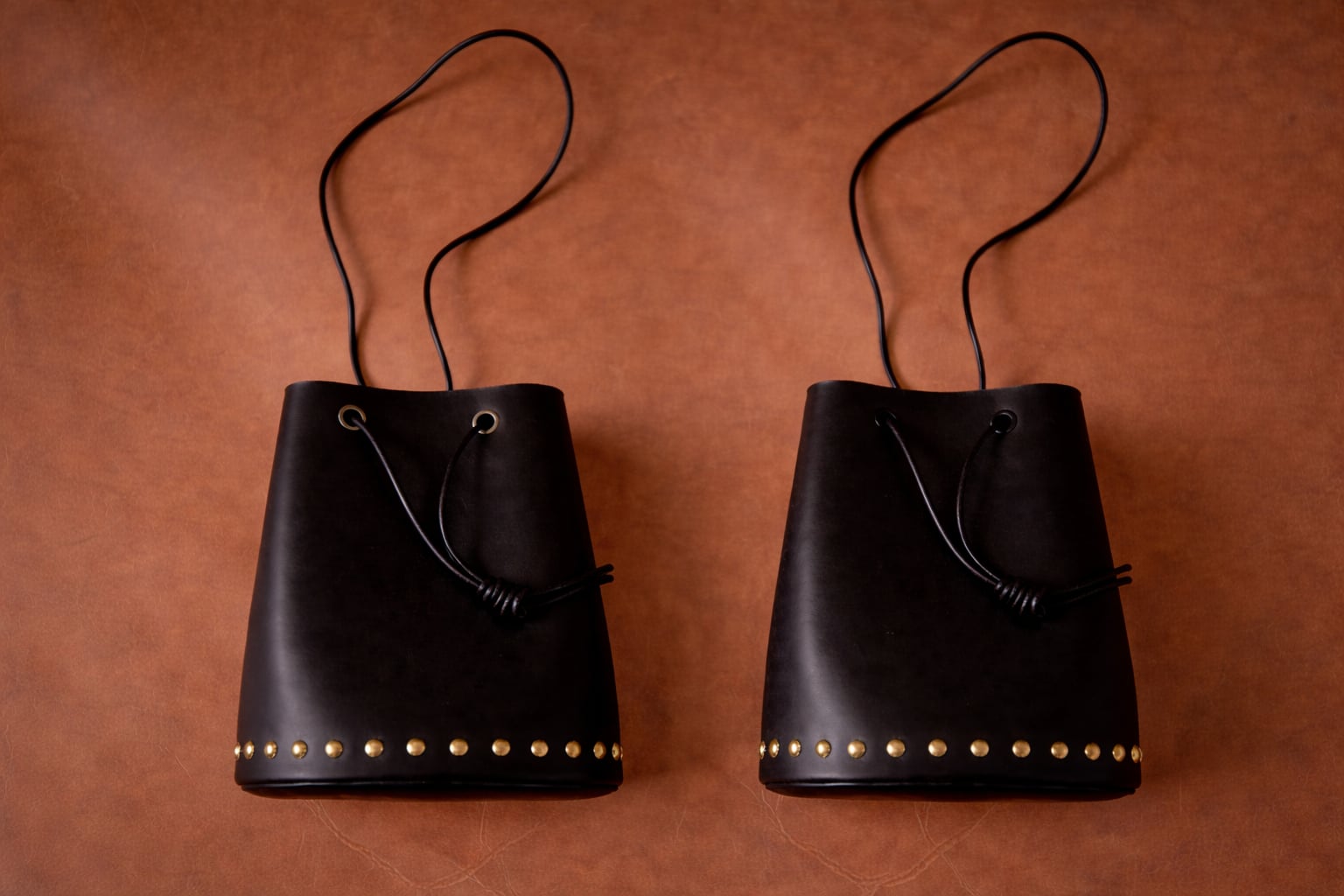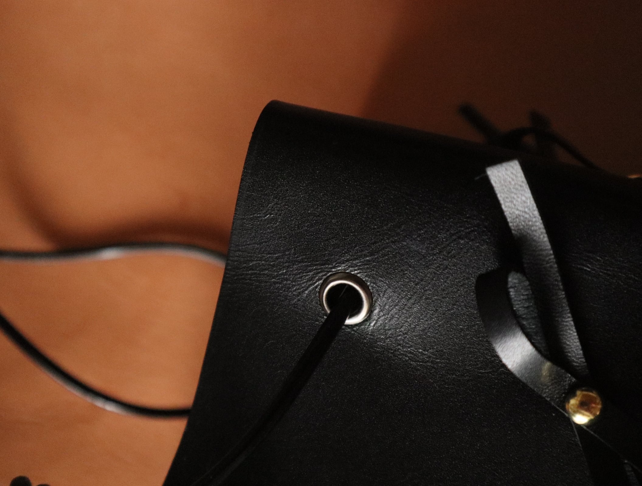裏地なし、レザー一枚仕立てのレザー巾着にハトメを付ける
