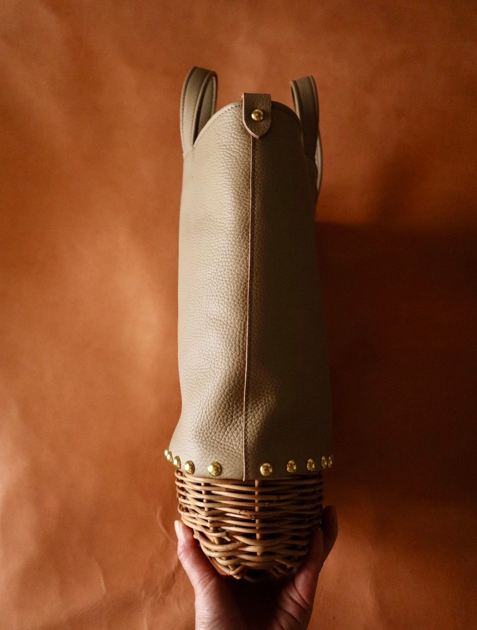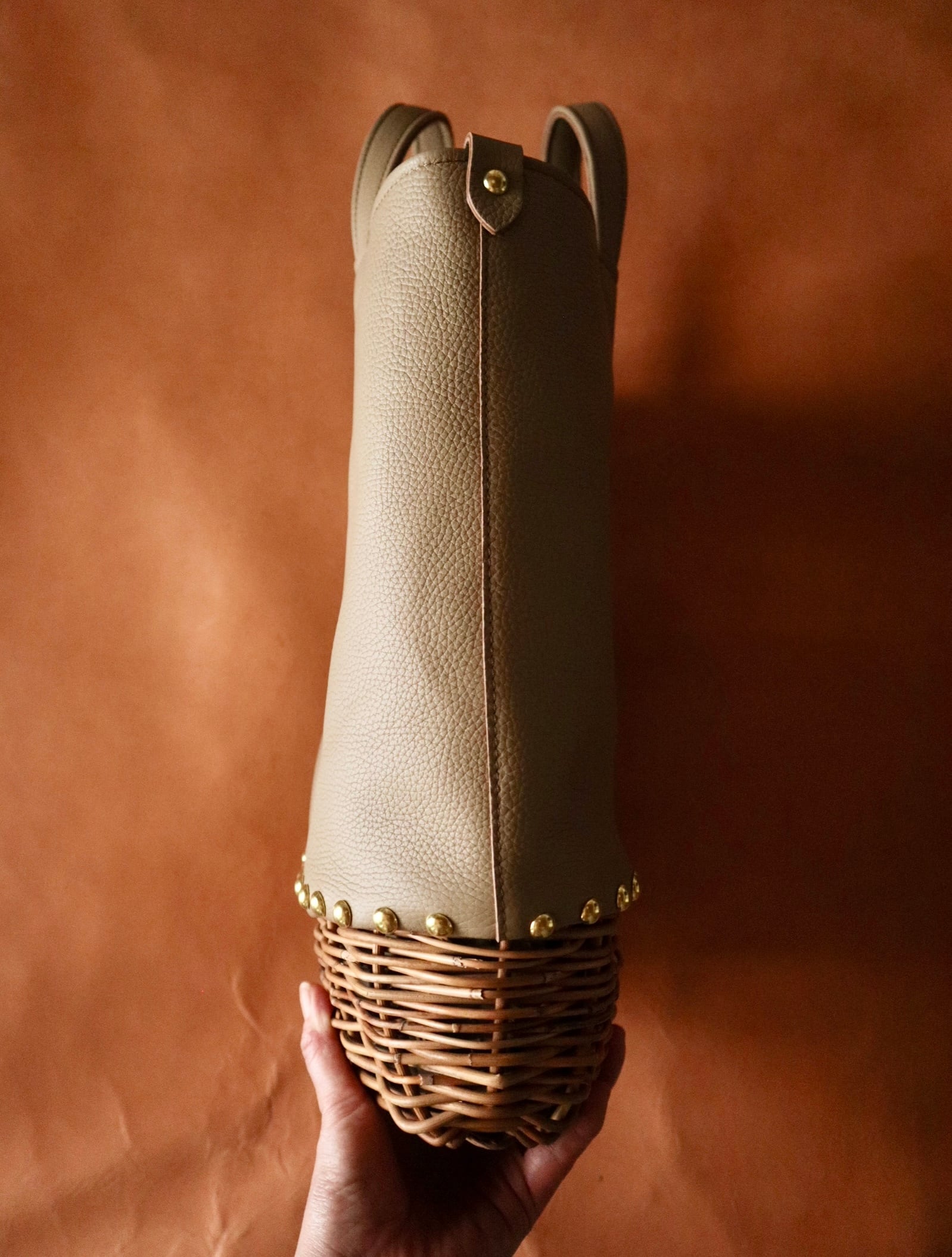 籐とレザーの組み合わせたバッグは新鮮で個性的、しかしエレガント〜フェミニンまたカジュアルなコーディネートにも持っていただけます。