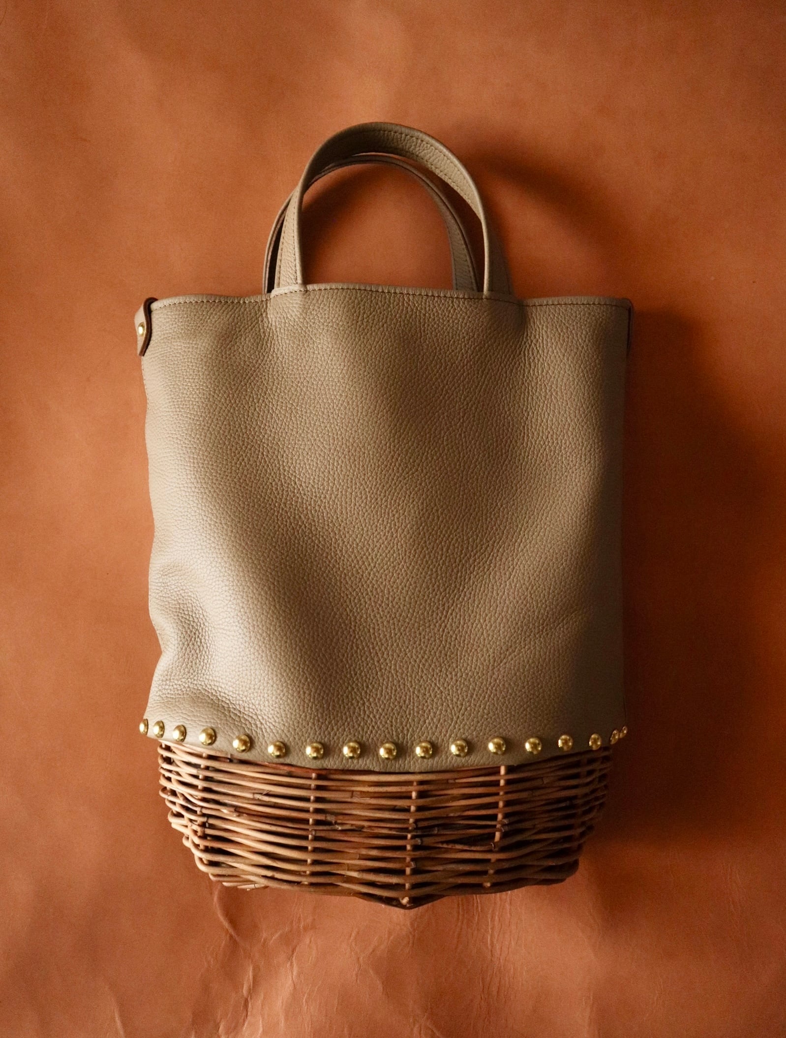 Ribbon bのかごバッグは紅藤・白籐・籐のかごとリアルレザーとスタッズなどの異素材をミックスした作品はオリジナルデザインです。